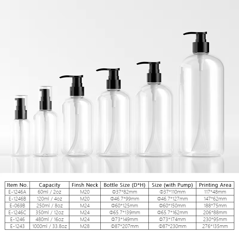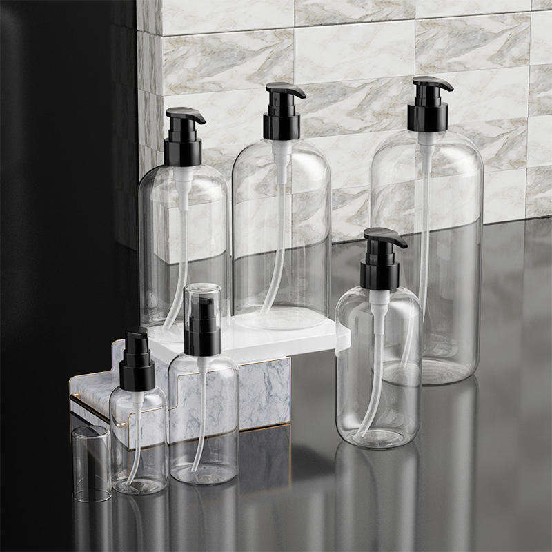 ขวดปั๊มพลาสติก PET ใสทรงบอสตัน ขนาด 2 ออนซ์ 4 ออนซ์ 8 ออนซ์ 12 ออนซ์ 16 ออนซ์ 33 ออนซ์ สำหรับบรรจุโลชั่น เจลอาบน้ำ แชมพู และเครื่องสำอาง