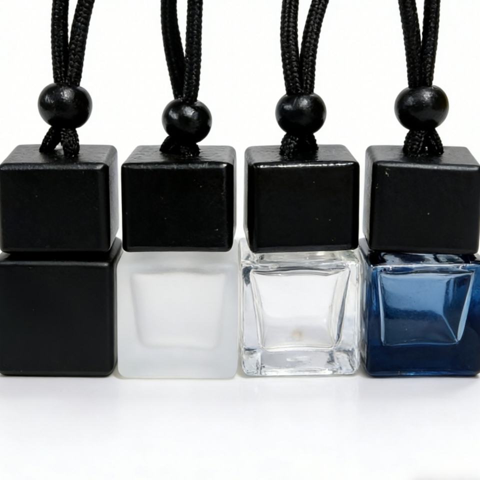 ขวดแก้วเปล่าสำหรับน้ำหอมปรับอากาศในรถยนต์ ขนาด 5 มล./8 มล./10 มล. พิมพ์ลายสกรีน ขวดน้ำหอมแบบแขวนพร้อมฝาไม้สีดำสำหรับน้ำมันหอมระเหย