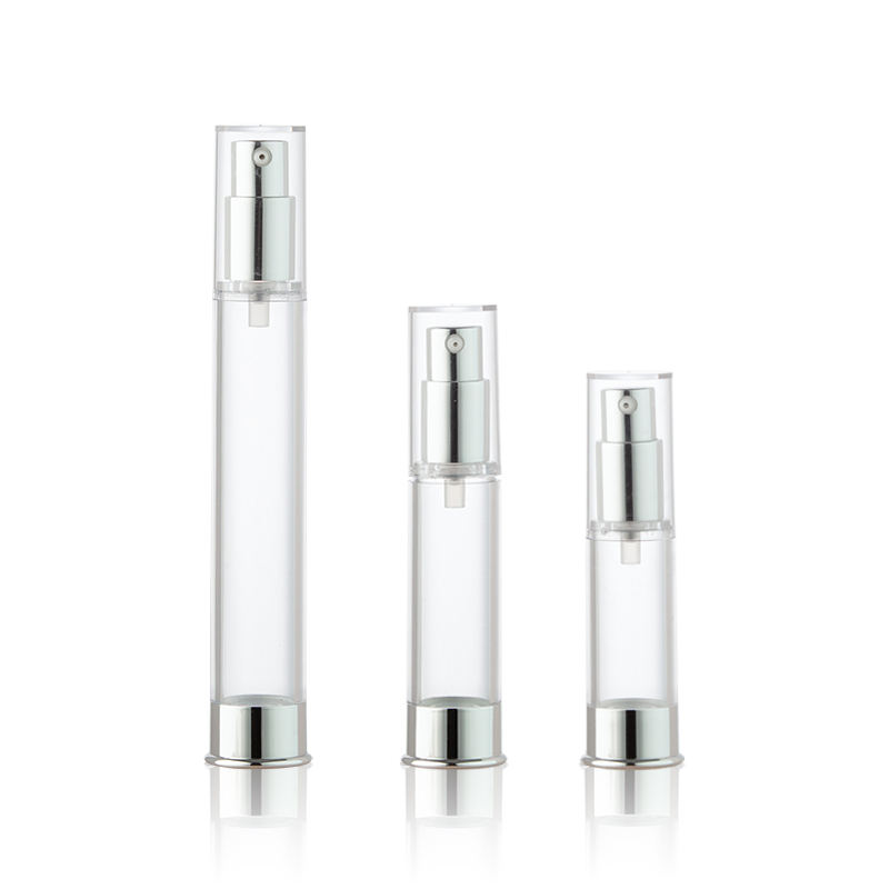 ขวดโลชั่นพลาสติกแบบสุญญากาศทรงเพรียวบาง ขวดพลาสติกแบบสุญญากาศสีเงิน ขนาด 10 มล. 15 มล. 20 มล. 30 มล. 35 มล.