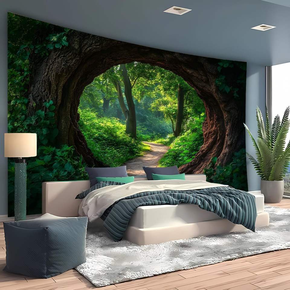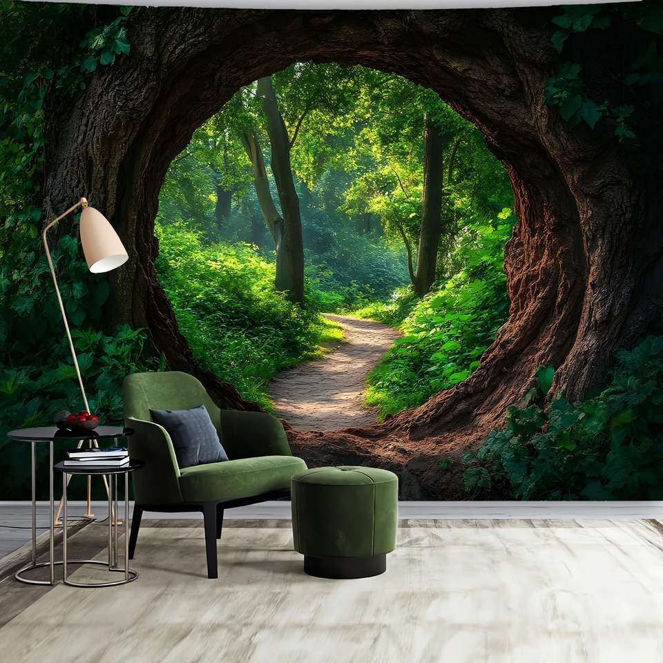 พรมปักลายป่ามหัศจรรย์ แสงแดดยามเช้าผ่านธรรมชาติ ทางเดินต้นไม้สีเขียว ถ้ำ ผนังแขวนลายฮาโลวีน มีสินค้าในสต็อก