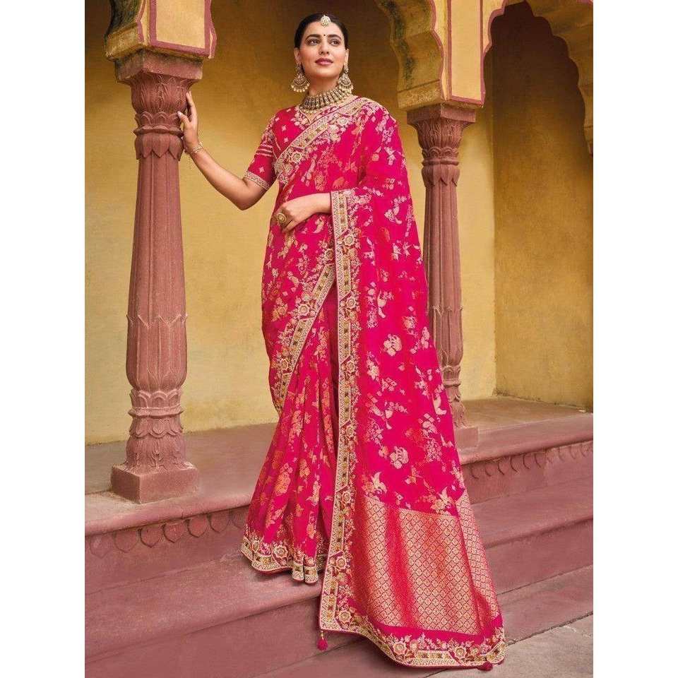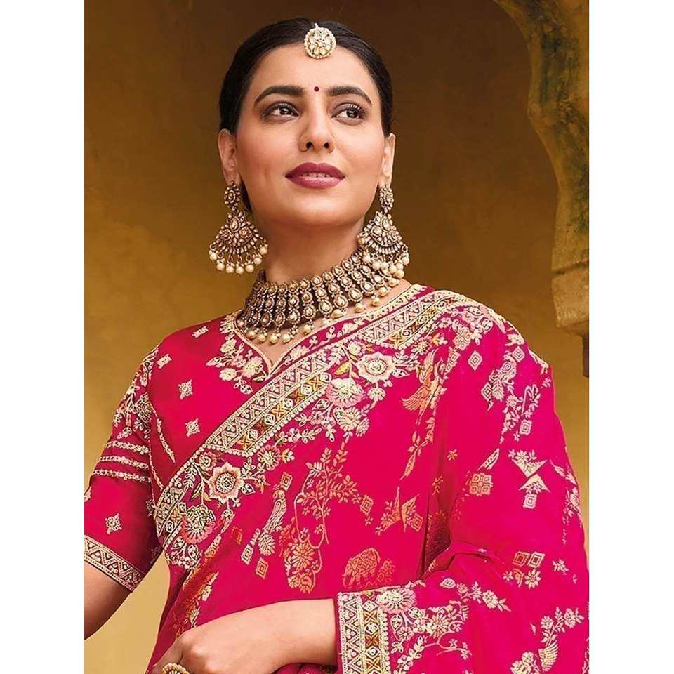 ผ้าไหมโดลาสีชมพูเข้มอันน่าหลงใหล บริสุทธิ์และดั้งเดิม พร้อมงานปักสำหรับงานแต่งงาน