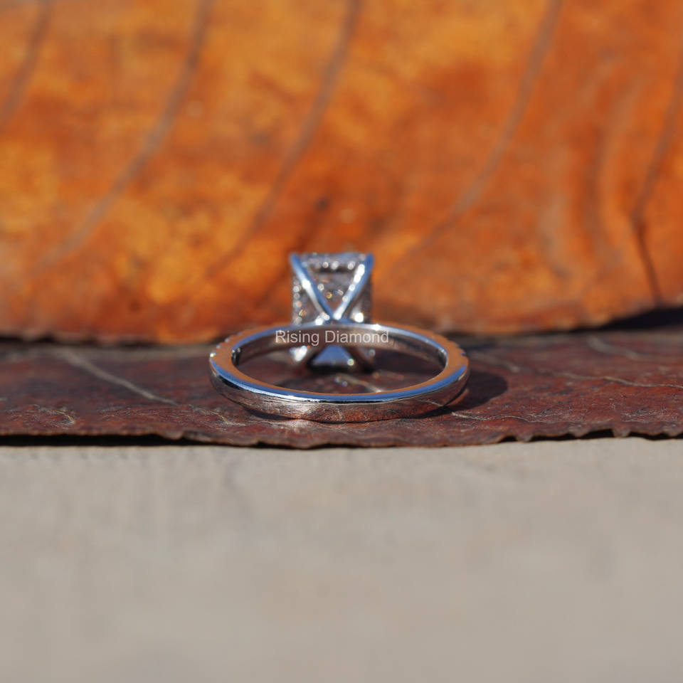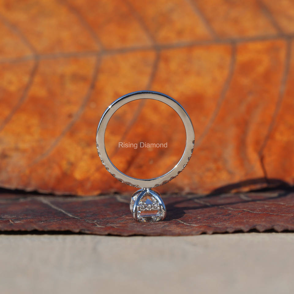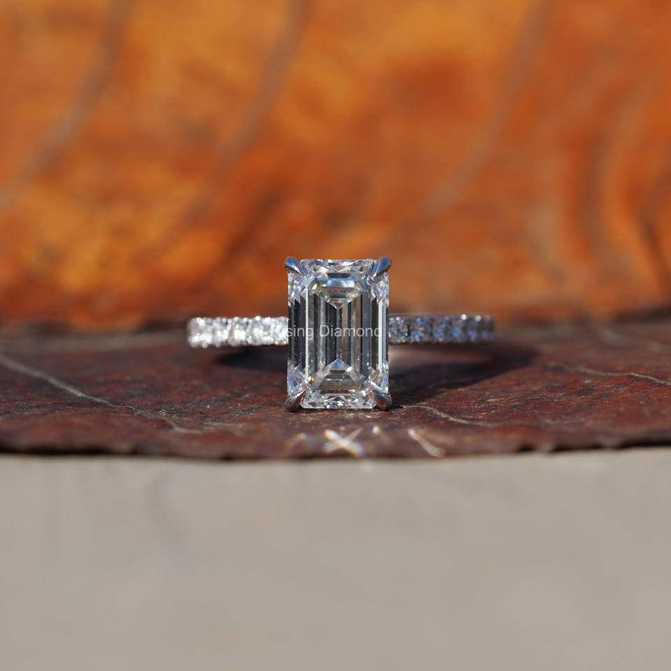 แหวนหมั้นเพชรที่เจียระไนจากมรกตเป็นของขวัญครบรอบปีที่ทำจากเพชรชุดรัศมีที่ซ่อนอยู่ของเธอแหวนเพชร CVD