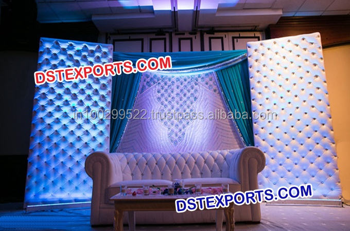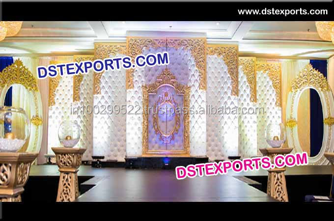 ภาษาอังกฤษเวทีต้อนรับงานแต่งงานสีขาวและเศษไม้หนัง Tufted แผงเวทีจัดงานแต่งงานที่สวยงาม Tufted เวที