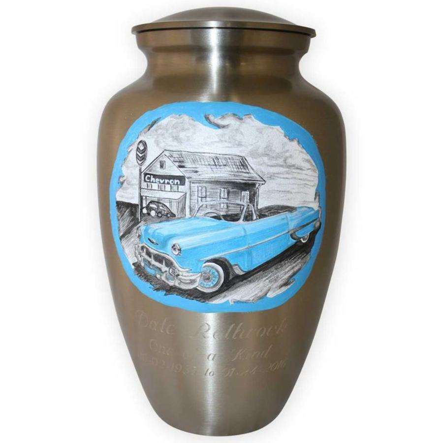 โกศใส่เถ้ากระดูกของมนุษย์ดีไซน์ใบมีดสำหรับใส่เถ้ากระดูกและโกศใส่ศพทำจากอัลลอยสีฟ้า