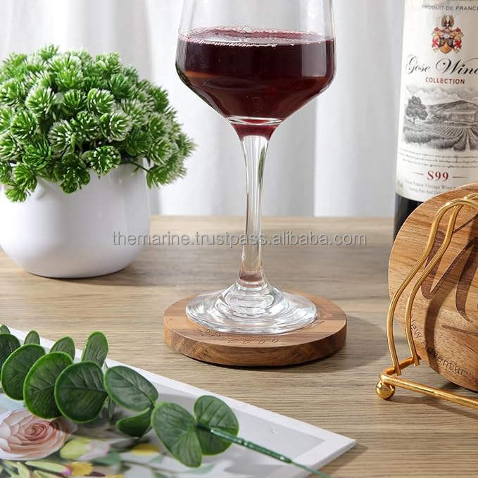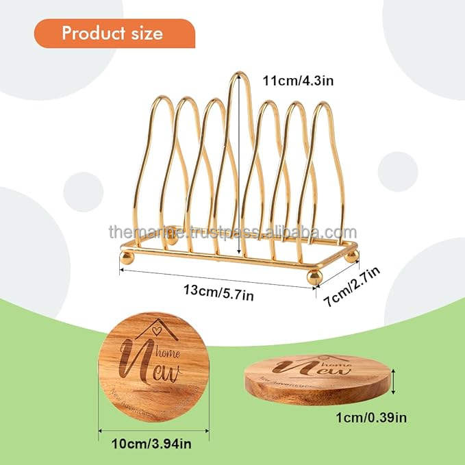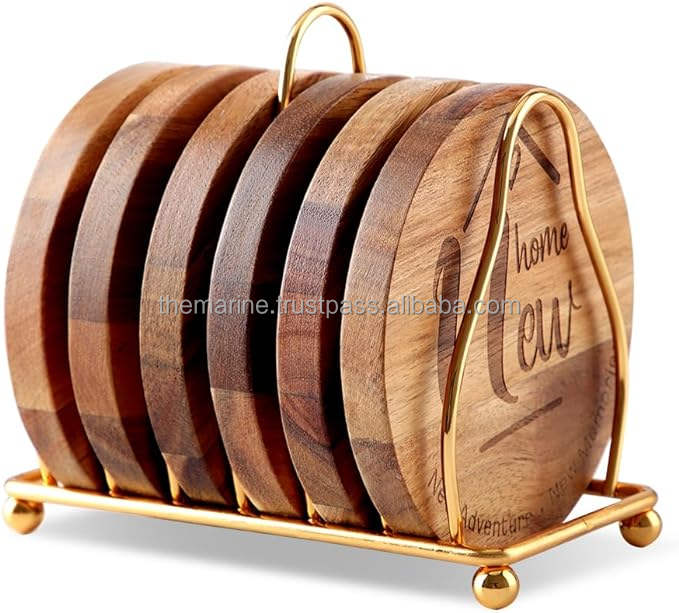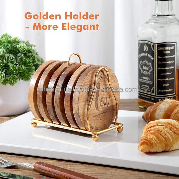 แผ่นรองแก้วไม้สีน้ำตาลและสีทองแบบสลักลาย รักษ์โลก ทันสมัย พร้อมที่วาง สำหรับเครื่องดื่ม ของขวัญขึ้นบ้านใหม่ และของตกแต่งบ้าน