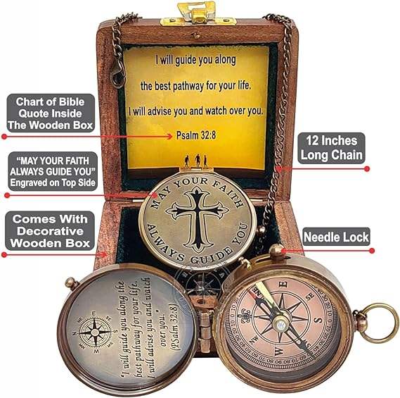 เข็มทิศทองเหลืองสลักเข็มทิศสำหรับตั้งแคมป์ของขวัญคริสเตียนสำหรับผู้ชายของขวัญคาทอลิกรับบัพติศมาสำหรับเด็กผู้ชายนำทางด้วยวัสดุไม้