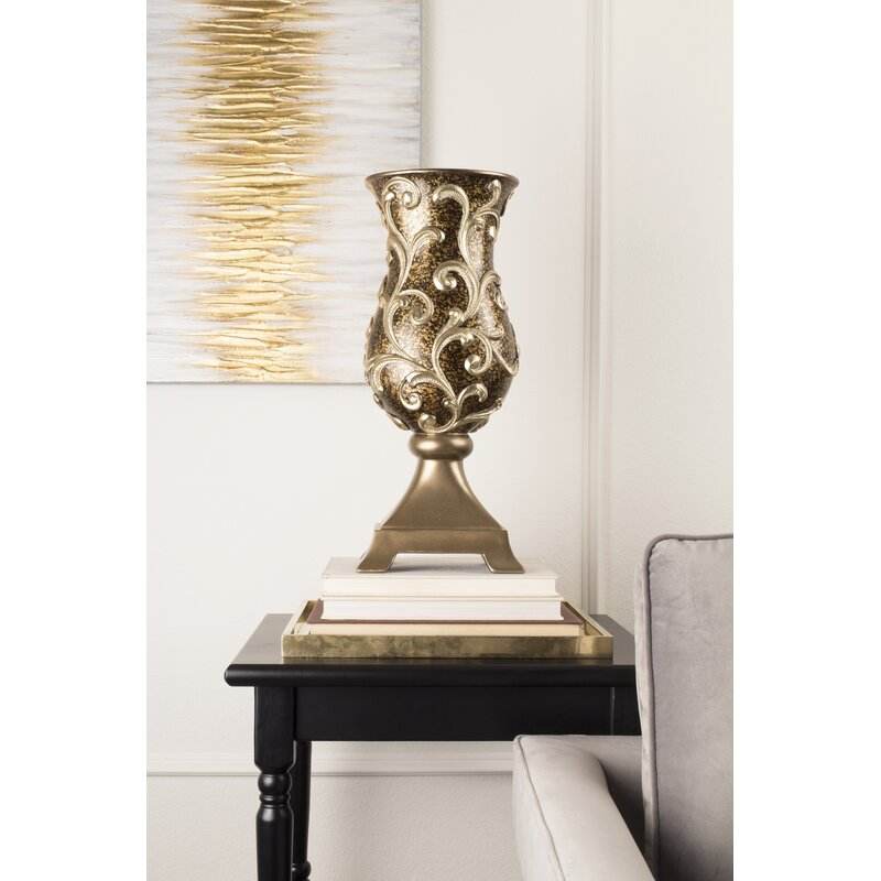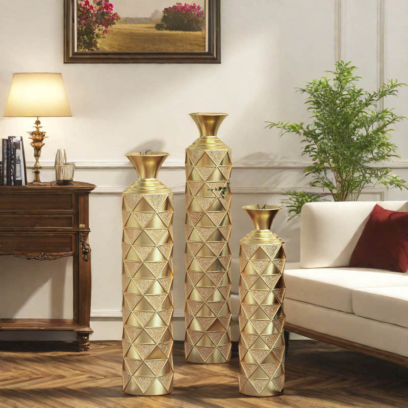 แจกันดอกไม้โลหะสลักลายดอกไม้สีน้ำตาลเข้มและสีทองตกแต่งเสร็จสมบูรณ์แบบสำหรับการตกแต่งห้องที่หรูหราและอุปกรณ์ที่ทันสมัย