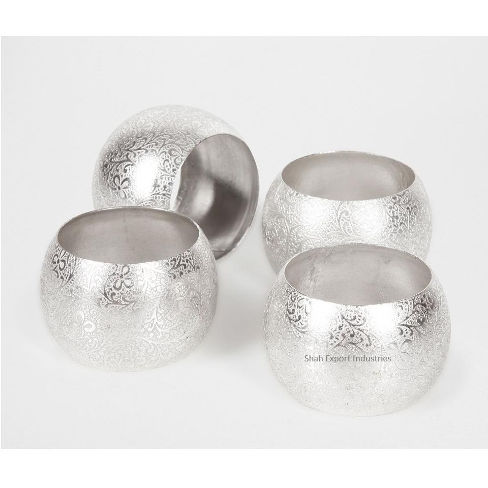 ห่วงใส่ผ้าเช็ดปากโลหะทรงกลมสีเงินโบราณแกะสลักออกแบบมาสำหรับตกแต่งโต๊ะรับประทานอาหารในงานแต่งงานที่บ้าน