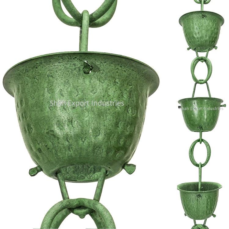 โซ่ฝนเหล็กสีเทาเข้มสำหรับรางน้ำและถังฝนสำหรับตกแต่งสวนป้องกันสนิมดีไซน์การแกะสลัก