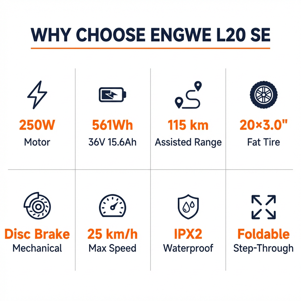 จักรยานไฟฟ้าพับได้ L20 SE ขนาด 20 นิ้ว 36V 15.6Ah ระยะทางไกล 115 กม. สำหรับการเดินทาง พร้อมตะกร้าและระบบกันสะเทือน