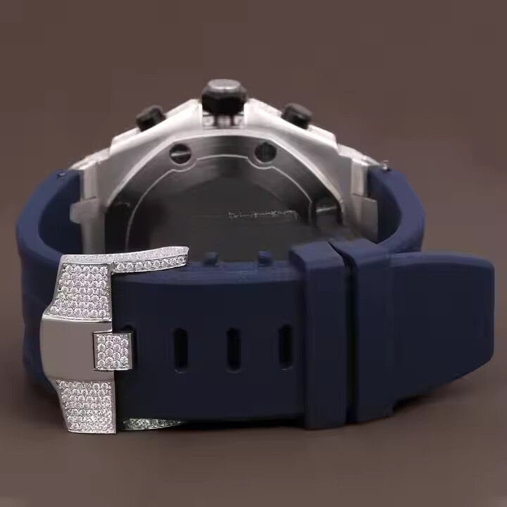 นาฬิกาสปอร์ตเพชรมอสซาไนต์สำหรับผู้ชายนาฬิกาควอตซ์สแตนเลสสตีลใส VVS เพิ่มคุณสมบัติของกระจกยางให้ดูทันสมัย