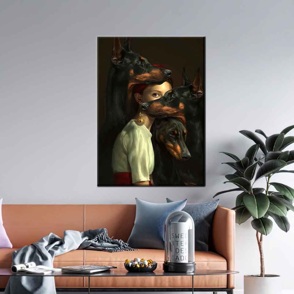 ผู้หญิงลึกลับกับโดเบอร์แมน ภาพพิมพ์บนผ้าใบ ศิลปะโกธิคแนวเหนือจริงสีเข้ม ห่อหุ้มอย่างดี
