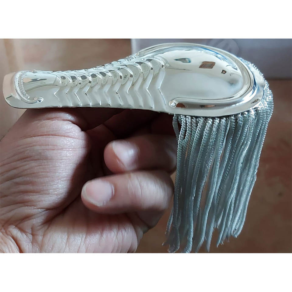 แผ่นประดับไหล่แบบมีพู่สำหรับวงโยธวาธิต ทำจากผ้าไหม พร้อมตะขอสำหรับแขวน สามารถปรับแต่งสีโลโก้ได้ ทำจากทองเหลือง สำหรับป้องกันตัว