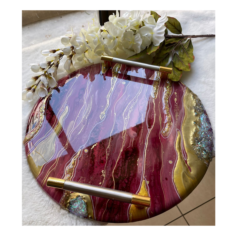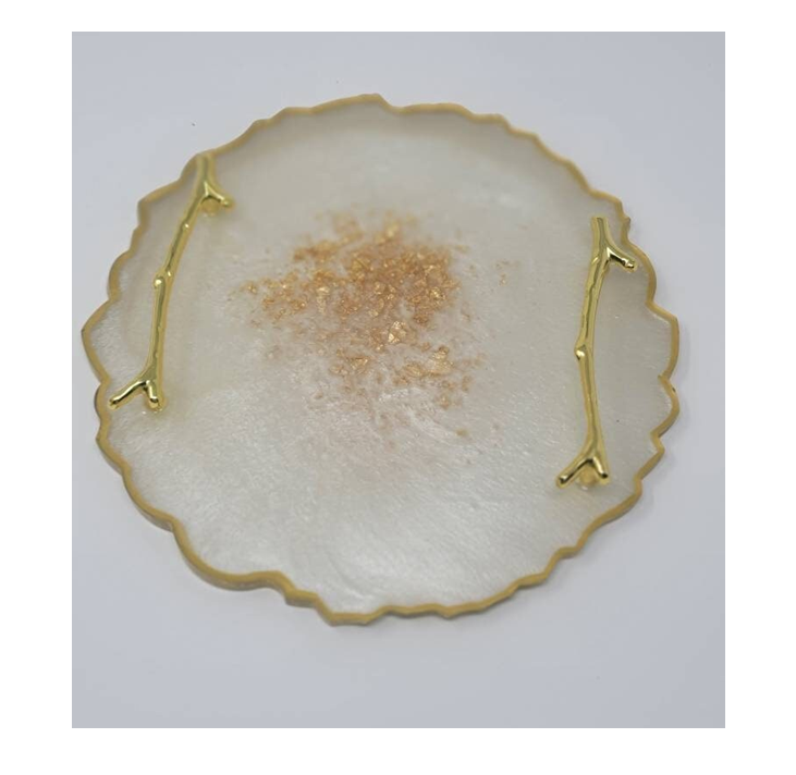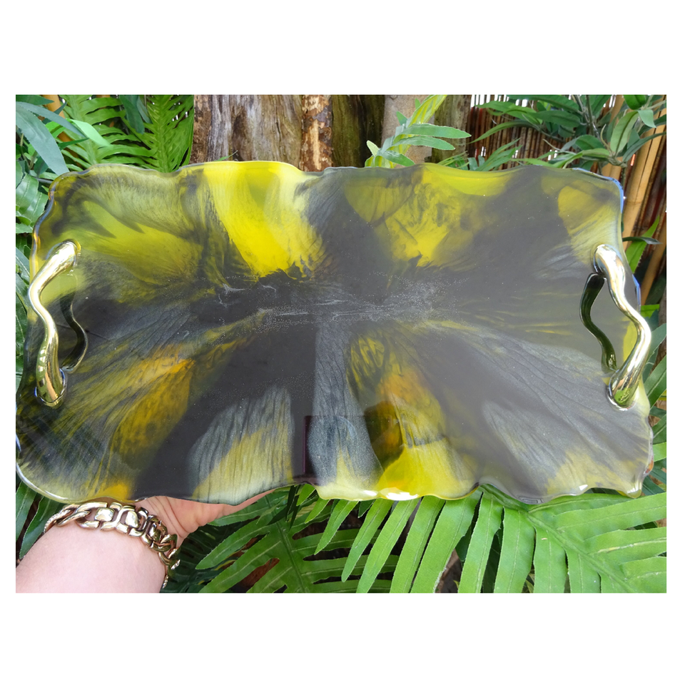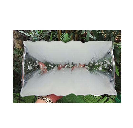 ถาดเสิร์ฟอาหารและผลไม้ทำจากเรซินอีพ็อกซี่พร้อมด้ามโลหะถาดเรซินขัดอาหารของโรงแรมทำด้วยมือ