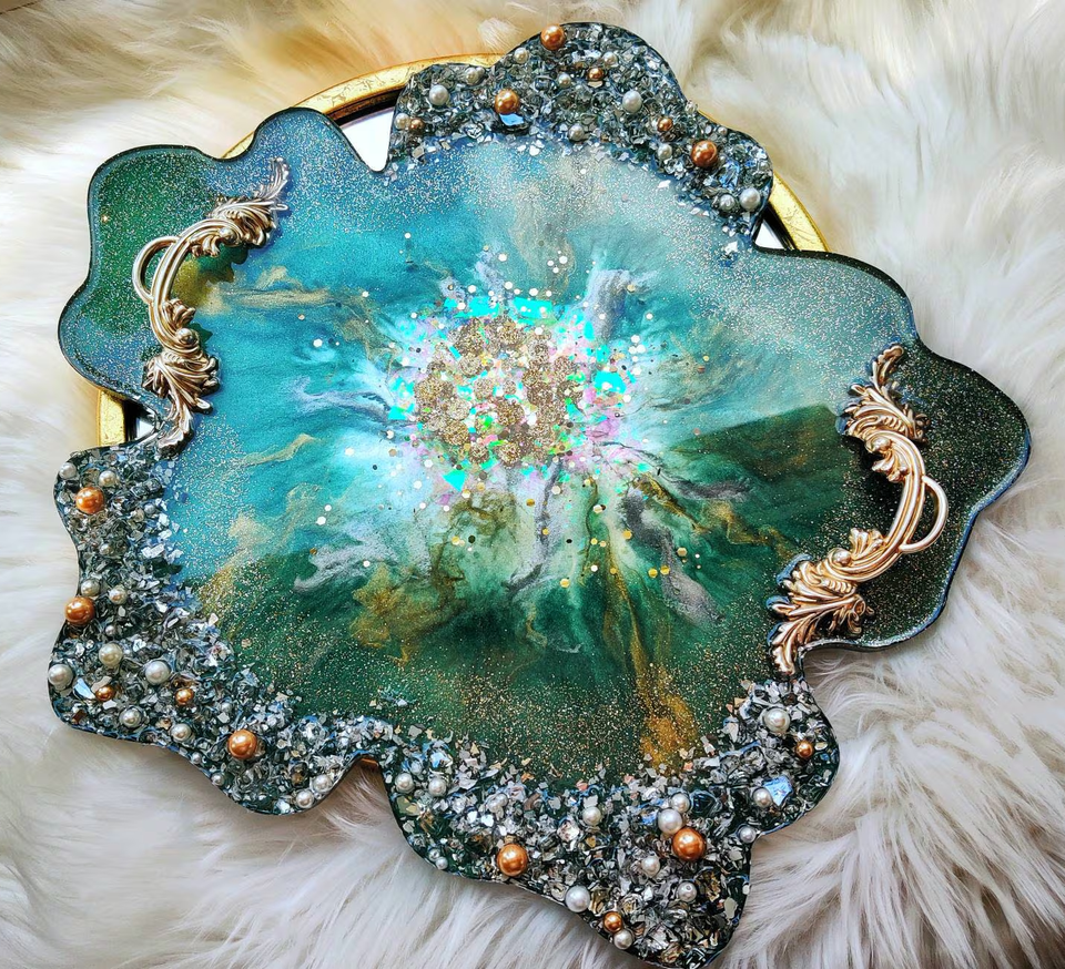 ถาดเสิร์ฟเรซินอีพ็อกซี่เรซินด้ามจับทองเหลืองสี่เหลี่ยมสีเทาและสีดำ