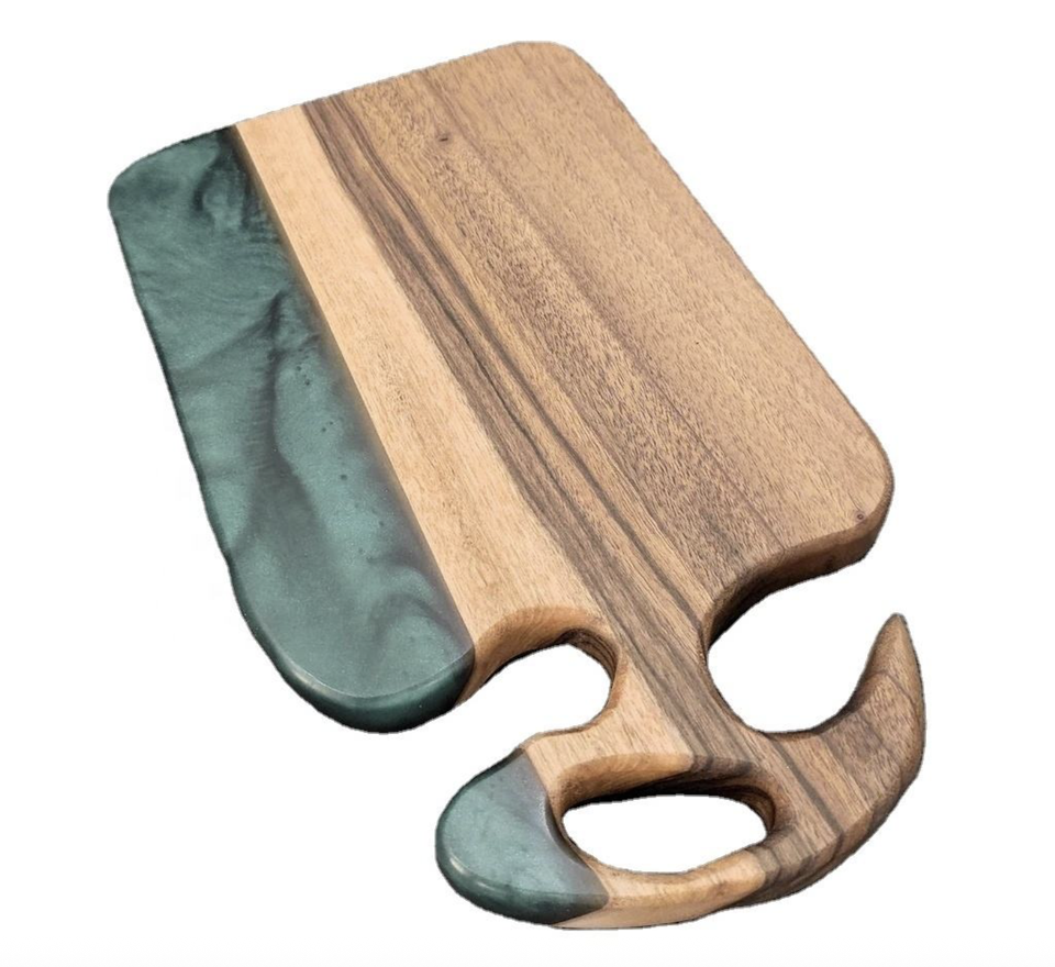 เขียงไม้อีพ็อกซี่ทำด้วยมือหรูหราขนาดใหญ่ที่กำหนดเองได้กระดานชาร์จแบตไม้สีดำธรรมชาติที่สวยงาม