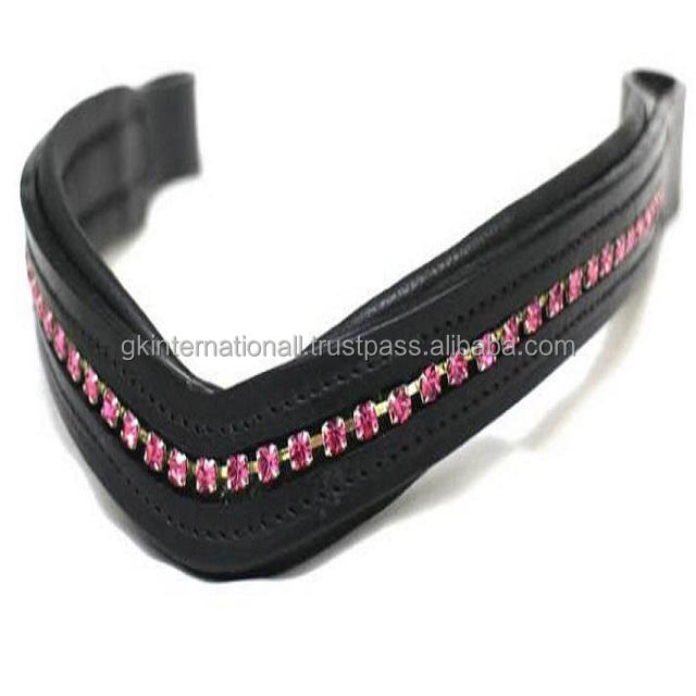 Equine Bling Multicolor Pearl and Crystal Decorative Chain Black Padded Leather Horse Brow Band in Curved Shaped All Custom Size