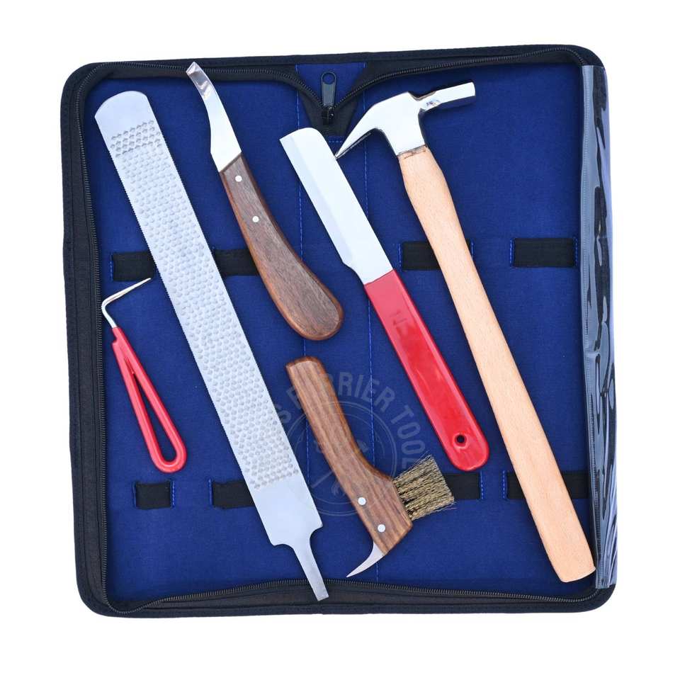 ชุดเครื่องมือช่างเกือกม้า สแตนเลส มีดตัดแต่งกีบโค้ง ตะไบแต่งกีบ ค้อนตอกตะปู แปรงทำความสะอาด กล่องเก็บอุปกรณ์ รองเท้าม้า