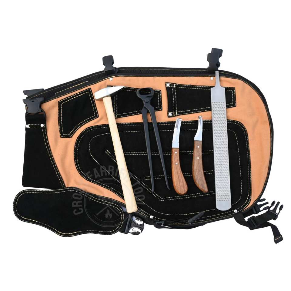 ชุดเครื่องมือช่างตัดแต่งกีบม้า พร้อมค้อน คีมตัดกีบ ผ้ากันเปื้อน มีดตัดแต่งกีบสองด้าน ใบมีดคมโค้ง ตะไบแต่งกีบสองด้าน
