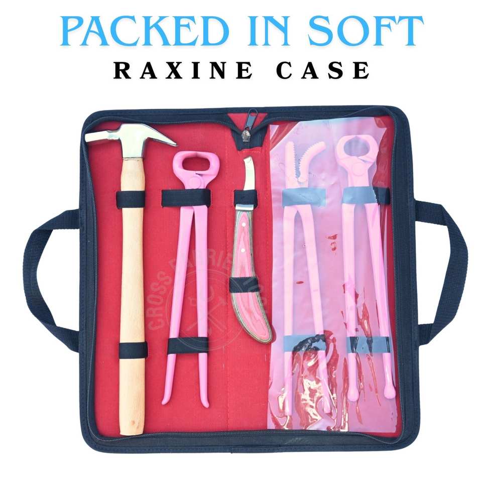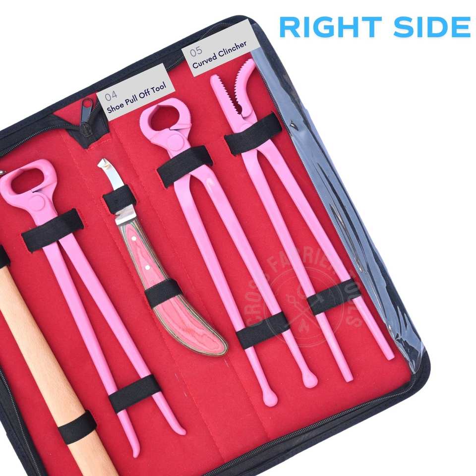 ชุดเครื่องมือช่างเกือกม้าพร้อมมีดตัดแต่งกีบสีชมพู คีมตัดกีบ คีมยึดกีบ คีมดึงรองเท้าม้า ค้อนตอกกีบม้า และเกือกม้า