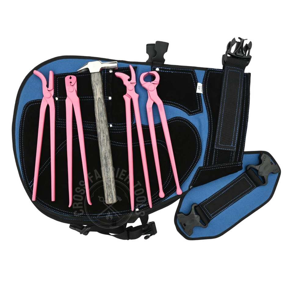 ชุดเครื่องมือช่างเกือกม้าพร้อมผ้ากันเปื้อน ค้อนสีดำ คีมถอนตะปู คีมถอดรองเท้าสีชมพู คีมปากจระเข้ และคีมปากโค้ง