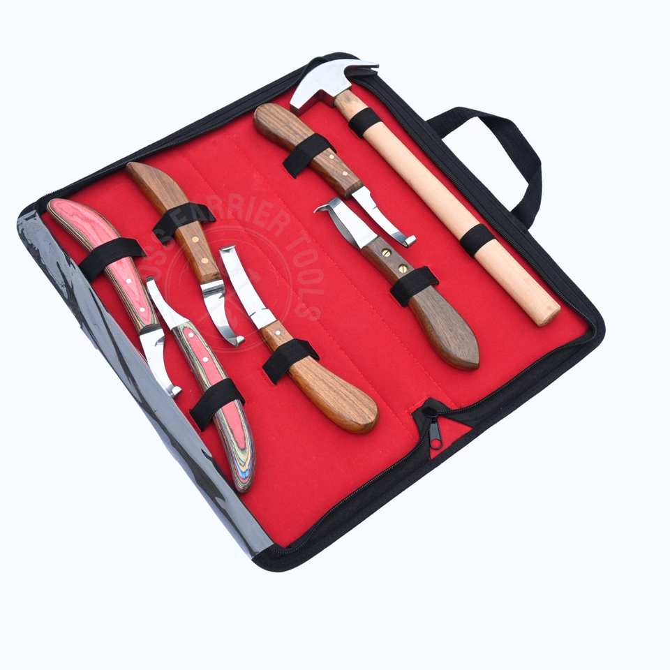 ชุดเครื่องมือช่างตัดแต่งกีบม้า ประกอบด้วย มีดตัดกีบใบแคบ มีดตัดกีบแบบถอดได้ขนาดใหญ่ ค้อนตีกีบแบบสองด้าน และค้อนตีกีบแบบวงแหวน