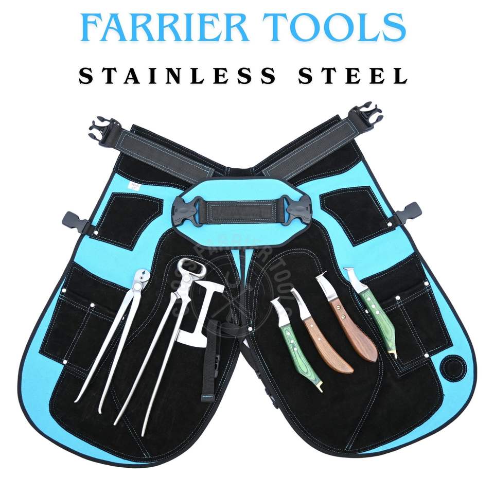 ชุดเครื่องมือดูแลกีบม้าพร้อมผ้ากันเปื้อนนิรภัย ที่ขัดกีบม้า ที่ดึงกีบม้า คีมตัดกีบม้า และมีดตัดกีบม้าแบบห่วง ปลายทองเหลือง ด้ามไม้