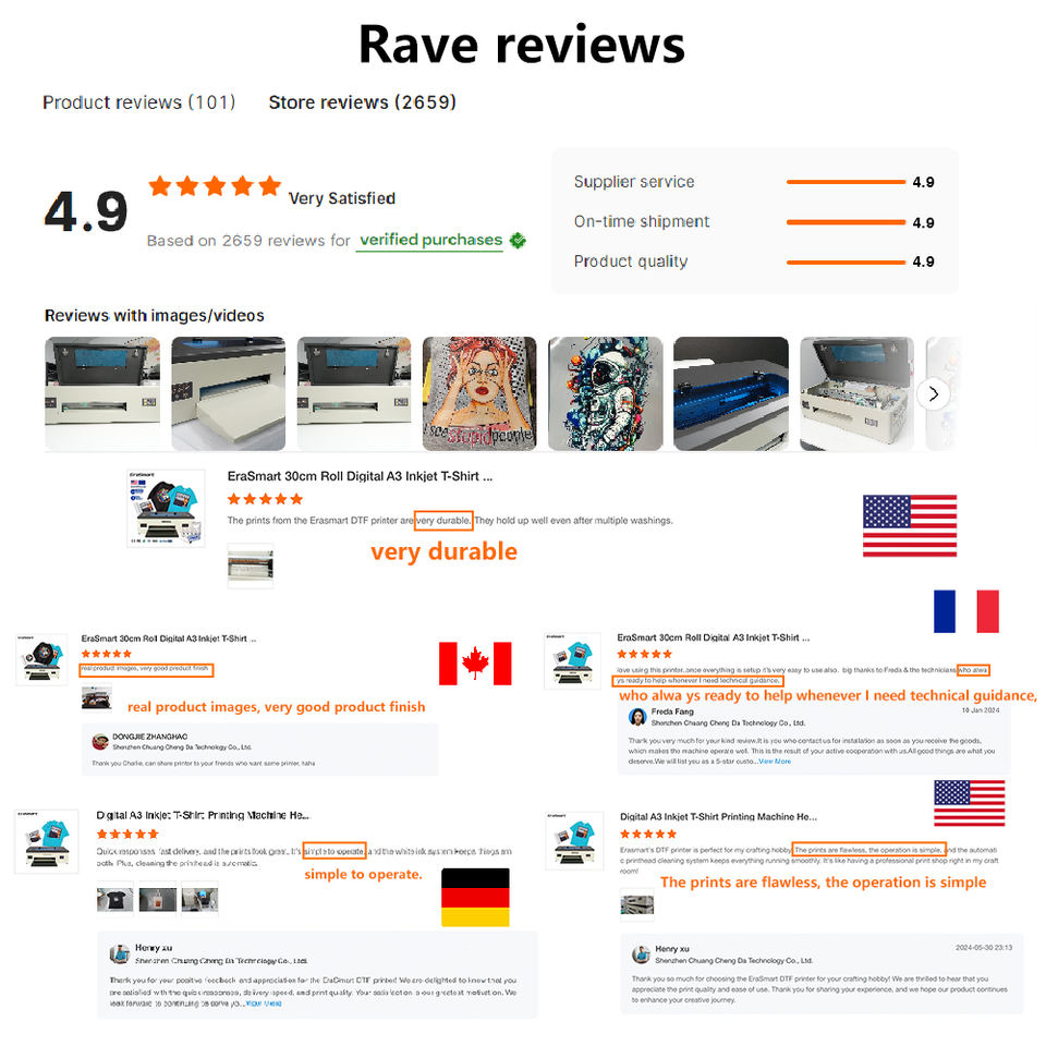 Erasmart จัดส่งฟรีไปยังสหรัฐอเมริกาเครื่องพิมพ์ดิจิตอล A3 DTF ขนาด30ซม. พิมพ์ DTF ด้วยความร้อนเครื่องพิมพ์1390อิงค์เจ็ท DTF สำหรับสิ่งทอใดๆ