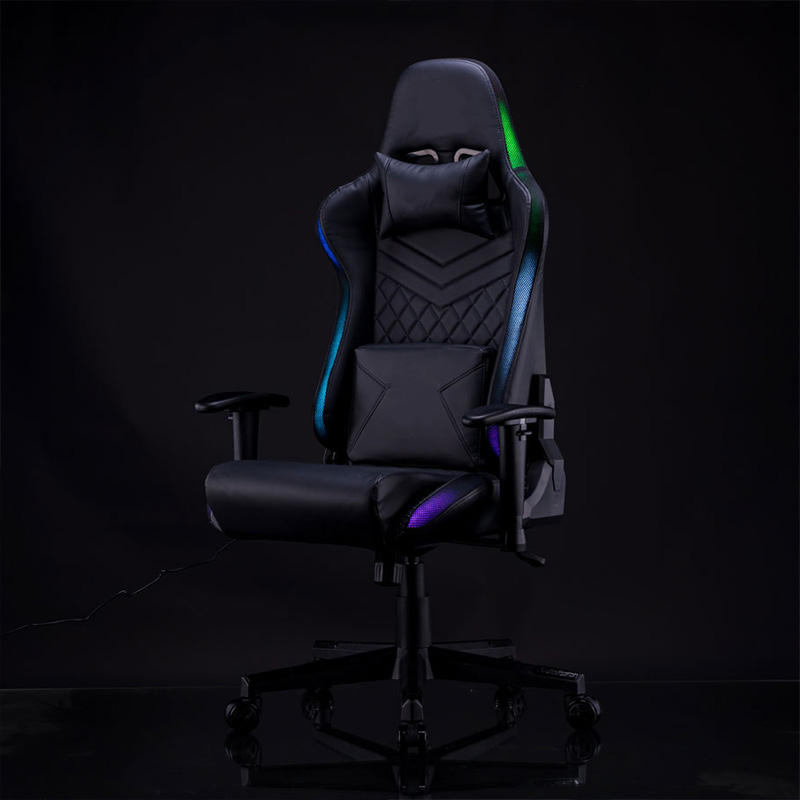 เก้าอี้เล่นเกมมีไฟ LED สีดำตามหลักสรีรศาสตร์พร้อมพนักพิงศีรษะเบาะรองเอวผ้าหนังเทียม