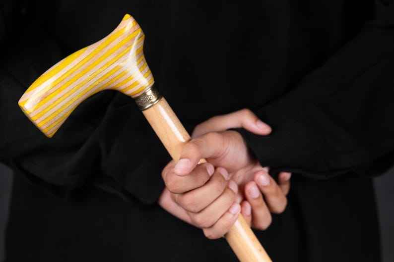 ด้ามจับตามหลักสรีรศาสตร์และพื้นผิวเรียบเนียนทำให้ไม้เท้าทำจากเรซิ่นและไม้ เหมาะสำหรับผู้สูงอายุ