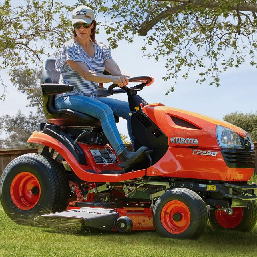 Kubota รถตัดหญ้าสำหรับขับขี่ T2290ที่นั่งสบายเครื่องยนต์เสียงรบกวนต่ำเหมาะสำหรับงานสนามหญ้าเป็นเวลานาน