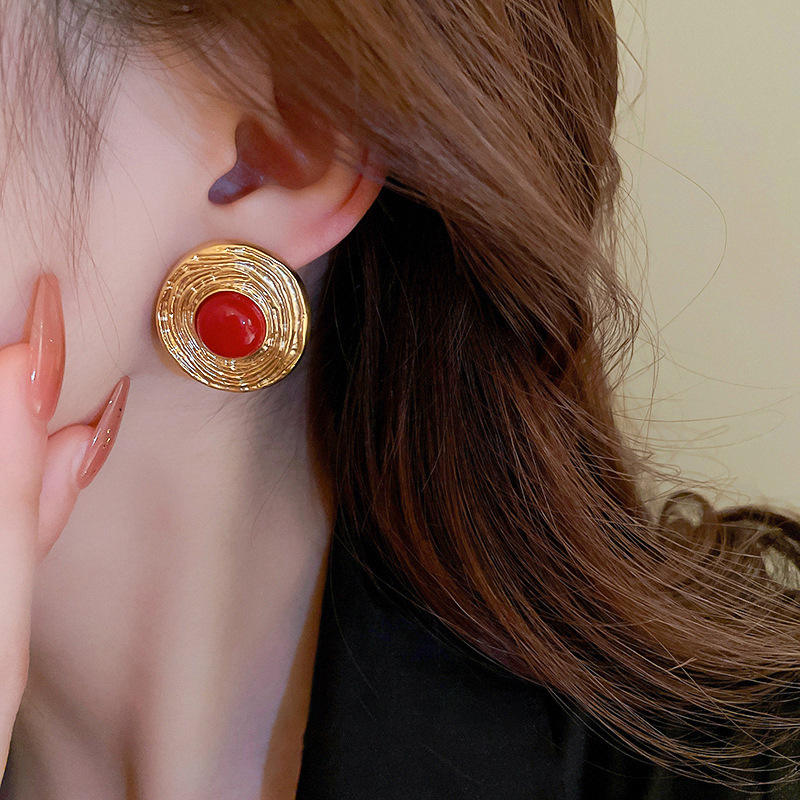 Erke Tipaki Stud Earrings Gold Plated Coral Bezel Setting Vintage Unisex Fashion Jewelry