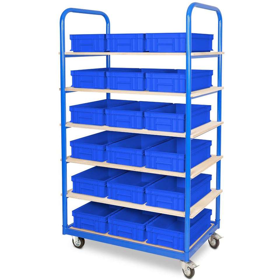 Etagenwagen MIT 6 ebenen, bxtxh 1050x500x1690มม., 2 Lenk- (MIT festellbremse) u. 2 bockrollen, bestückt MIT 18 euroboxen, bxtx