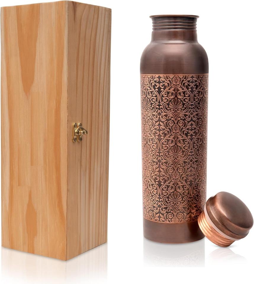 ขวดน้ำทองแดงสลักที่ออกแบบมาอย่างดีมีความทนทานมาพร้อมกล่องขนาดมาตรฐานสำหรับขายของขวัญ