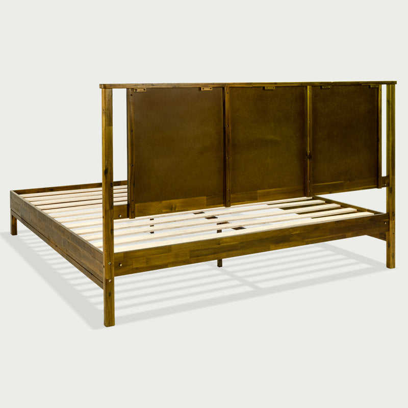 Modern Minimalist Solid Wood Platform Bed with Hand Carved Geometric Parquet Headboard for Bedroom or Guest Room Furniture