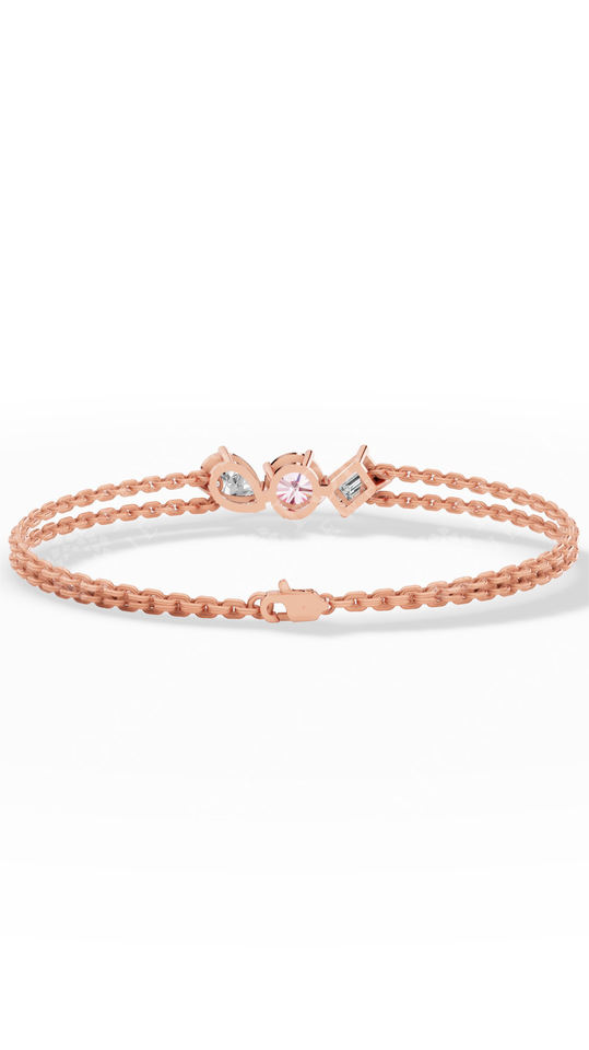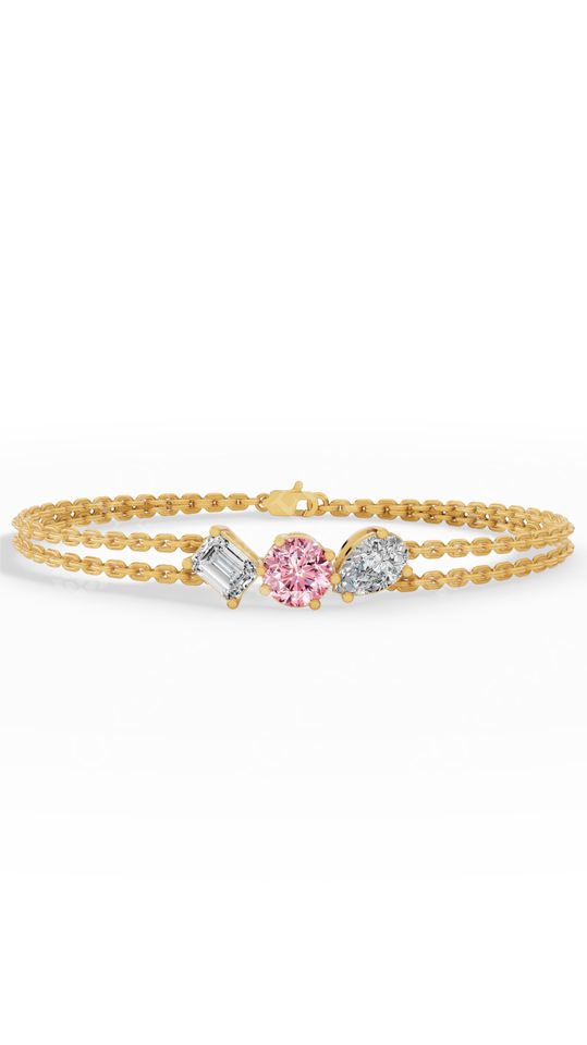 สร้อยข้อมือสองเส้นประดับเพชรแล็บโกรว์ทรงกลมสีชมพูอ่อน พร้อมเพชรทรงลูกแพร์และทรงเหลี่ยมมรกต ทอง 10K เครื่องประดับหรูหรา
