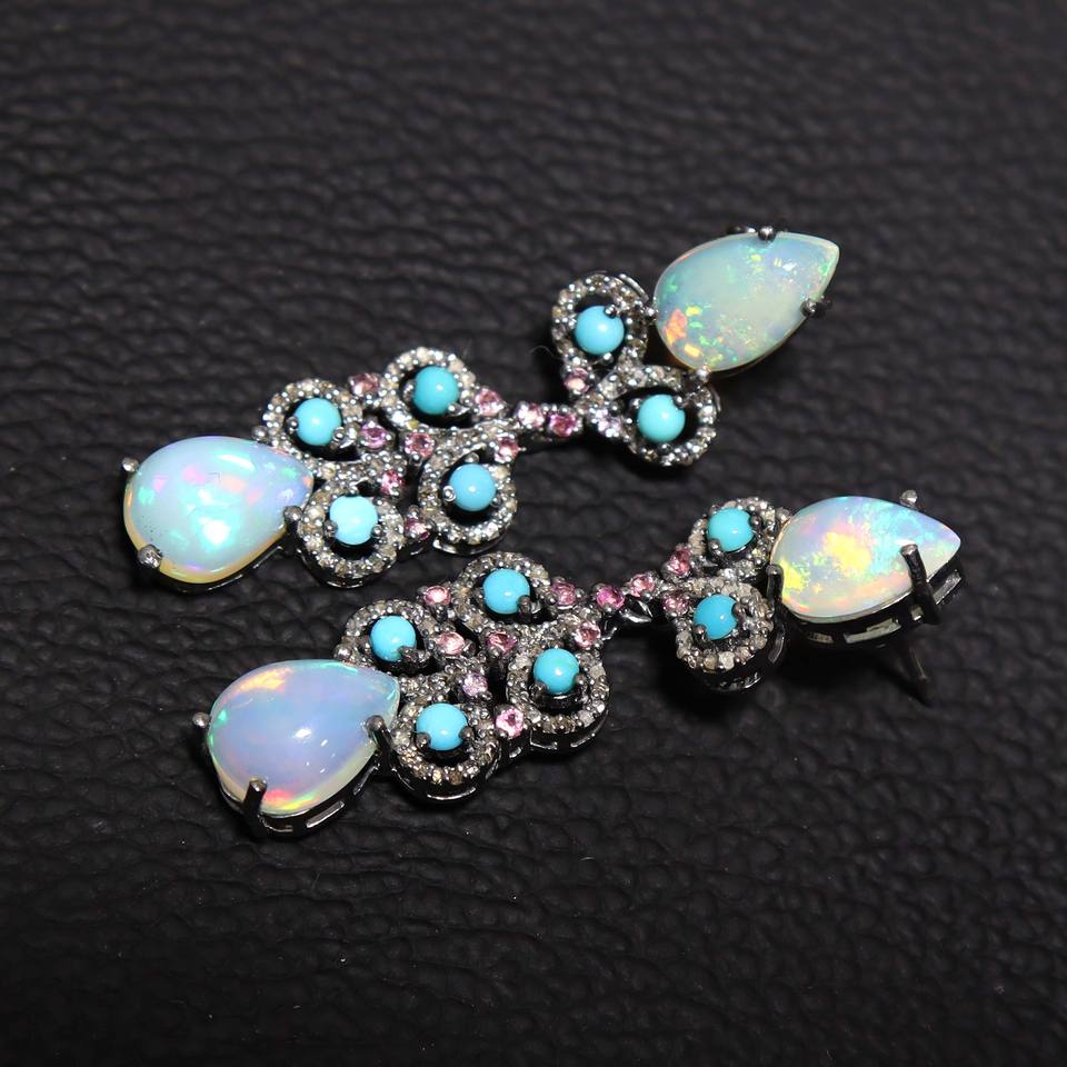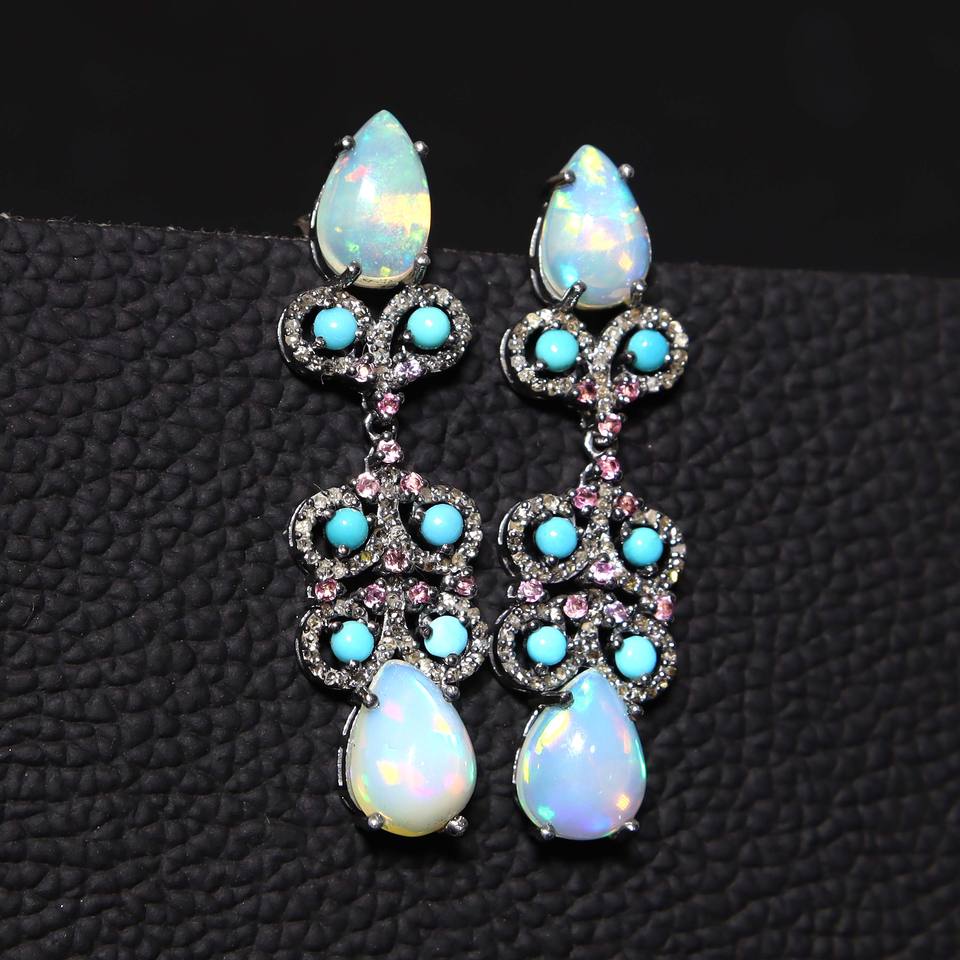 Ethiopian Opal & Arizona Turquoise With Diamond Silver Earrings Diamond Earring Beauty Turquoise Earrings Set Top Quality