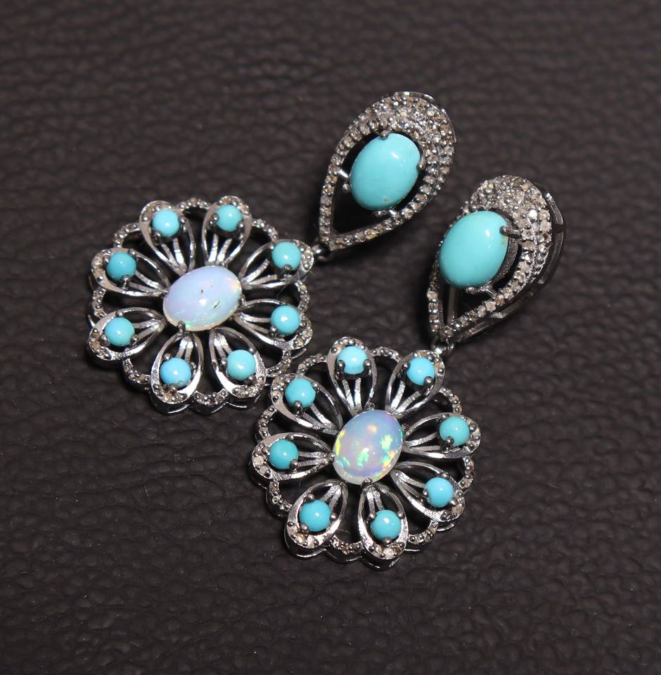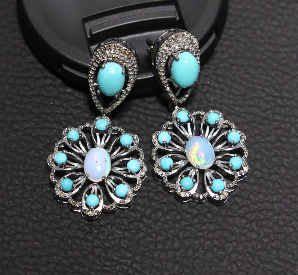 Ethiopian Opal & Arizona Turquoise With Diamond Silver Earrings Diamond Earring Beauty Turquoise Earrings Set