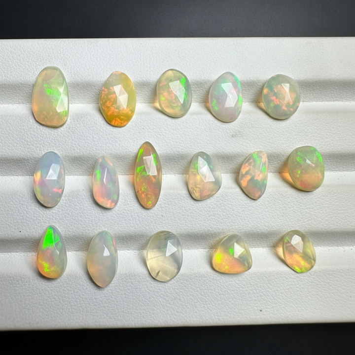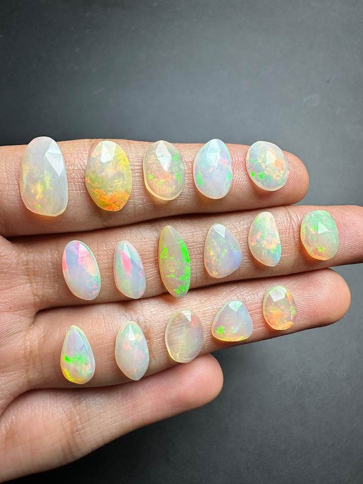 พลอยโอปอลสีขาวของเอธิโอเปียตัดเป็นพลอยโอปอลจากเอธิโอเปียอันน่าทึ่งตัดด้วยแสงแวววาวและพลอยโอปอลที่งดงามไม่เหมือนใคร