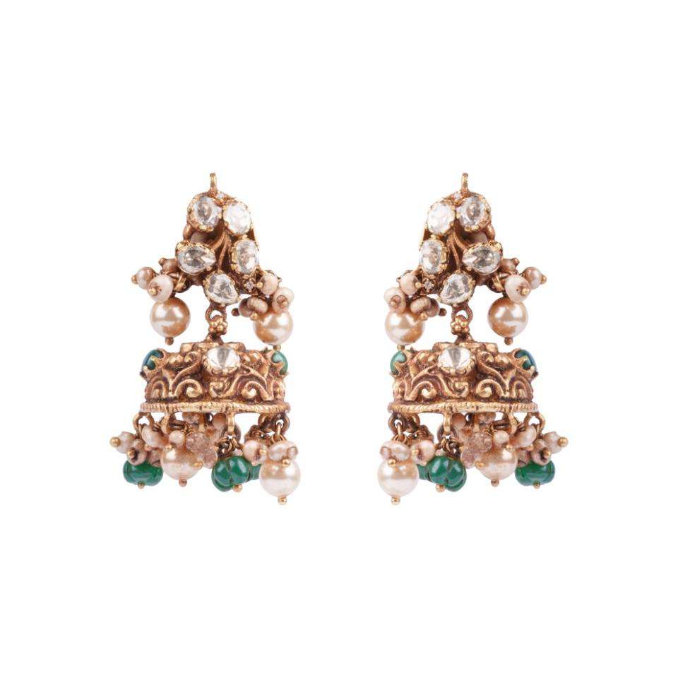 ต่างหูแบบจุมกี รุ่น Gajaah เงินแท้ 925 ประดับมุกและหยกคุณภาพสูง พร้อมลูกปัดสีเขียวมรกต ชุบทองคำ