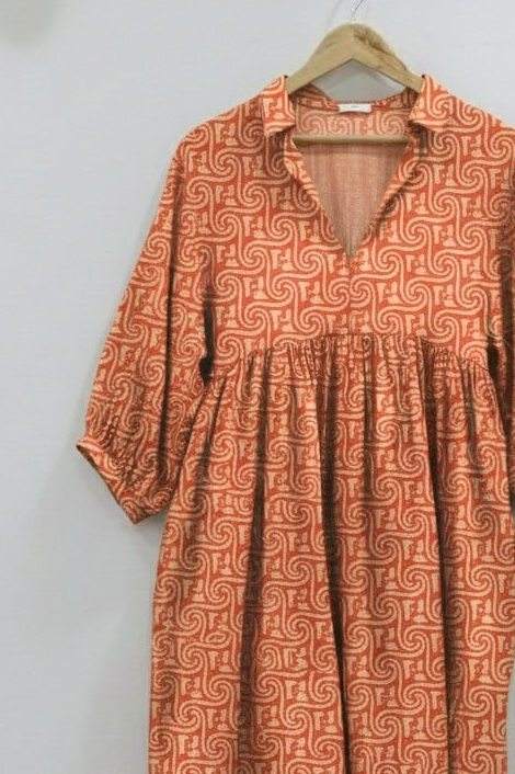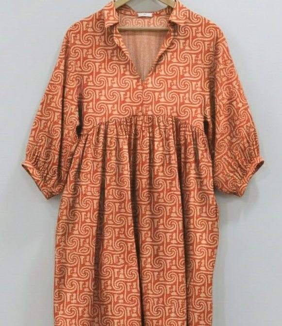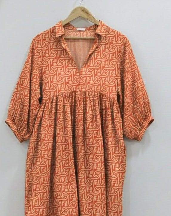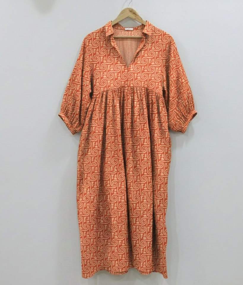 ชุดเดรสยาวปานกลางลายดอกไม้แบบพิมพ์มือสไตล์ชนเผ่าสำหรับผู้หญิง | เป็นมิตรกับสิ่งแวดล้อม ผ้าฝ้าย 100% ระบายอากาศได้ดี เอวธรรมชาติ ทรงเอ เรียบง่าย