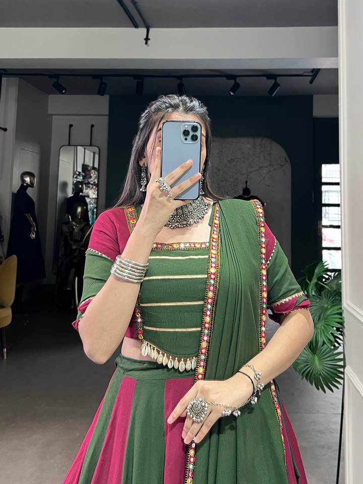 ชานียาโชโอลีสำหรับงานแต่งงานงานปักกระจกส่องแบบชนเผ่าอินเดียสำหรับงานแต่ง