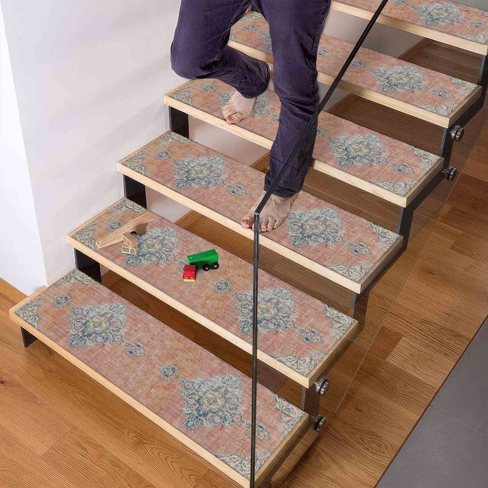 พรมพิมพ์ลายชาติพันธุ์ - พรมปูบันไดสีน้ำเงินซีดสไตล์โมเดิร์น กันลื่น ซักเครื่องได้ ผ้าโกเบลน
