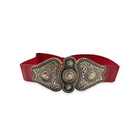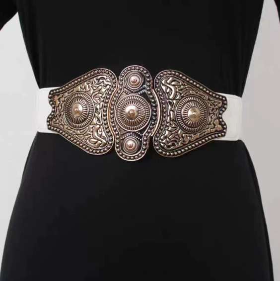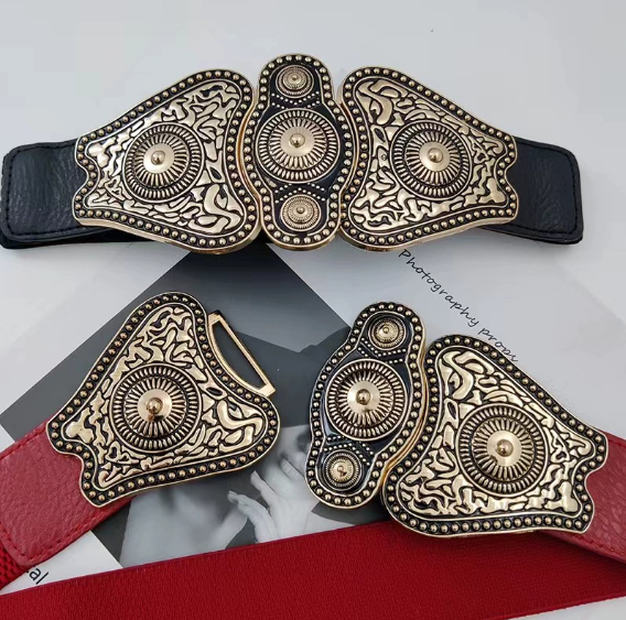 เข็มขัดยืดได้สไตล์เรโทรชนเผ่าเข็มขัดแฟชั่นหัวเข็มขัดแกะสลักสำหรับผู้หญิงเข็มขัดรัดเอวกว้างแบบลำลอง
