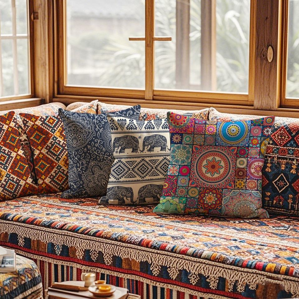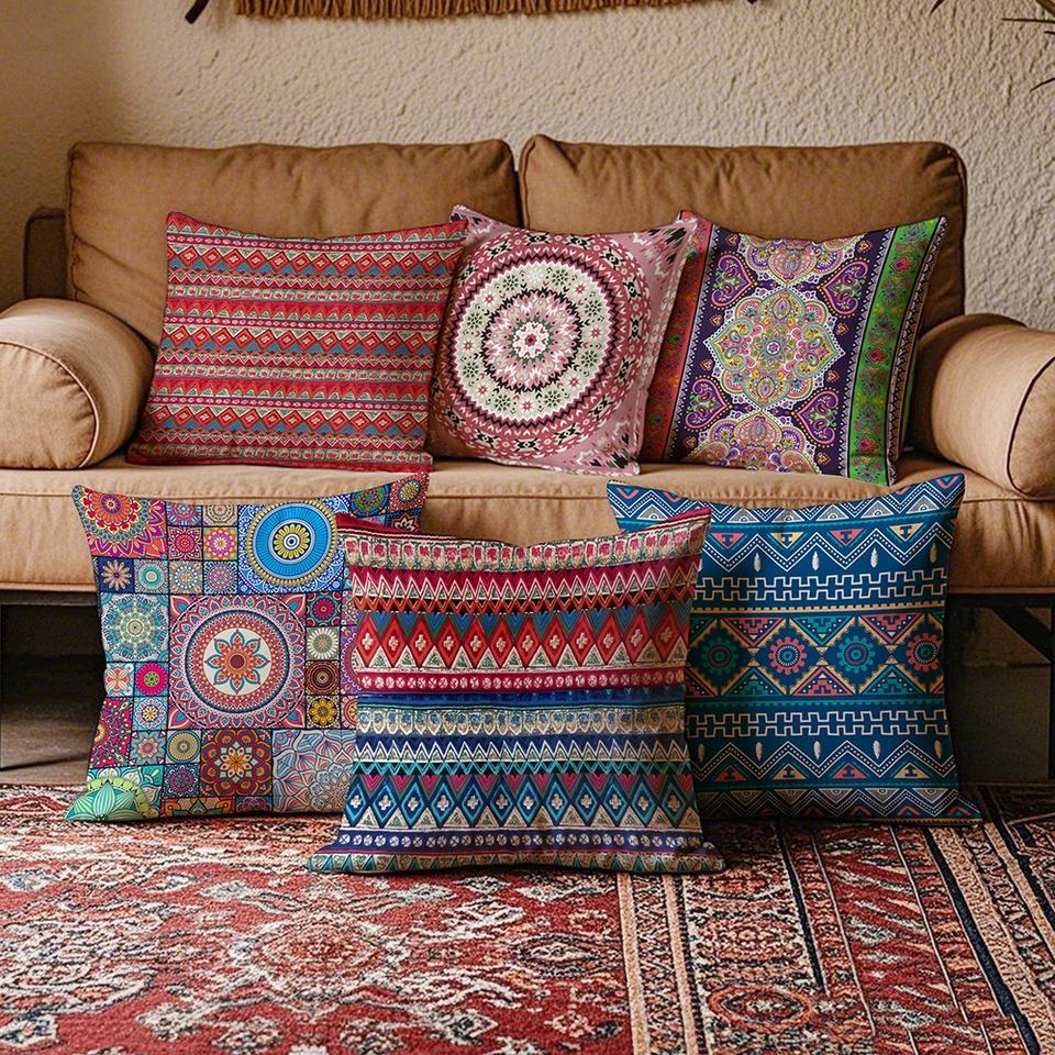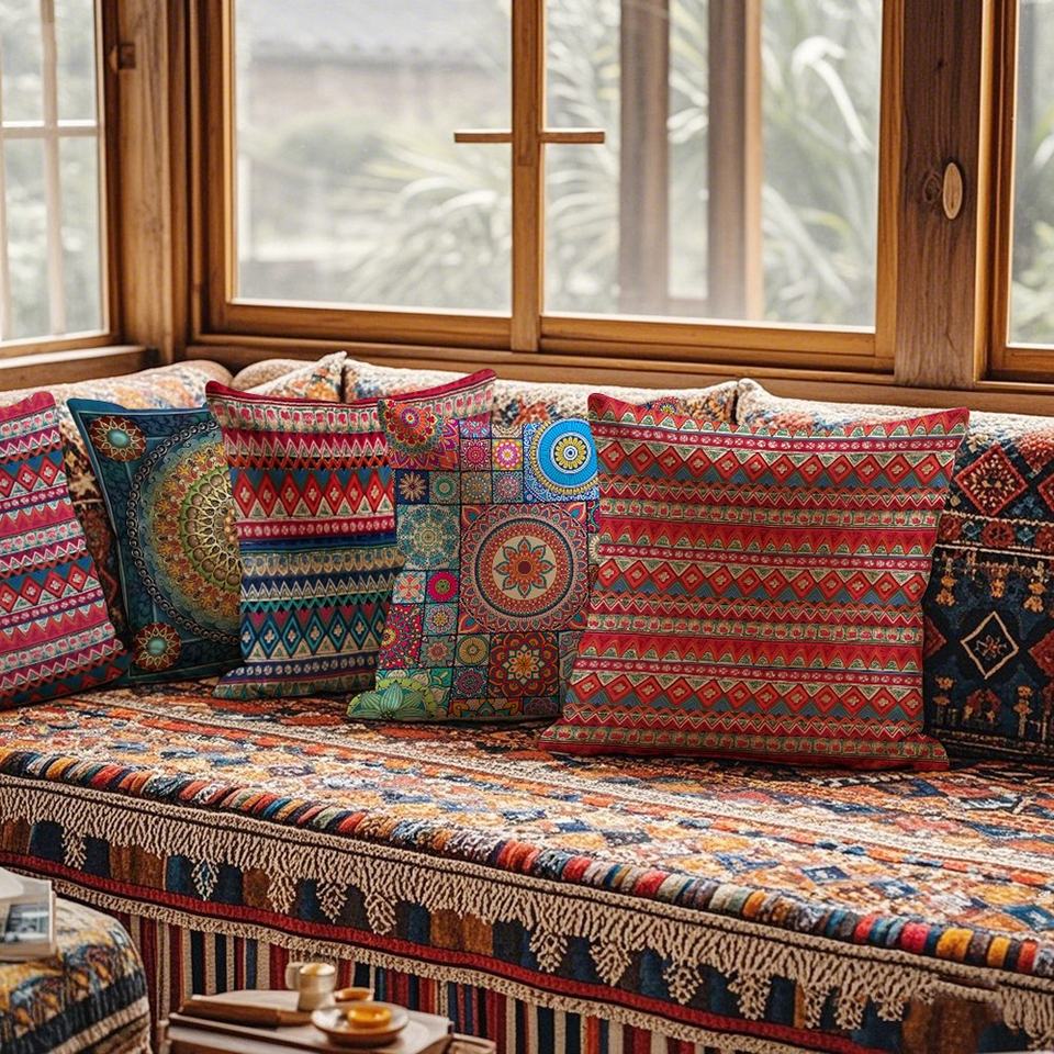 หมอนพิมพ์ลายเพลงพื้นบ้านสไตล์โบฮีเมียนย้อนยุคแบบชาติพันธุ์ สำหรับโรงแรม ห้องนั่งเล่น พนักพิงโซฟา - รูปทรงปรับแต่งได้