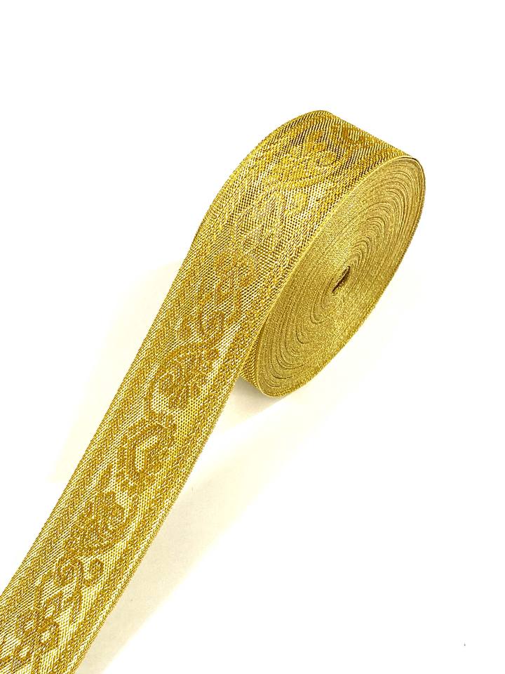 ริบบิ้นลายชนเผ่าแบบจาการ์ด ทอเป็นลายดอกไม้เล็กๆ สีทอง สีเงิน ความทนทานสูง โพลีเอสเตอร์ 100% เป็นมิตรกับสิ่งแวดล้อม สำหรับทำกระเป๋าเสื้อผ้า