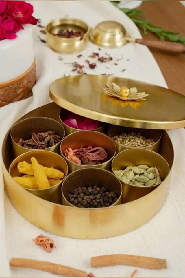 ของตกแต่งห้องครัวสไตล์ชนเผ่ากล่องมาซาลาทองเหลืองแกะสลักสไตล์โบราณเหมาะสำหรับจัดเครื่องเทศในบ้านอย่างสง่างาม