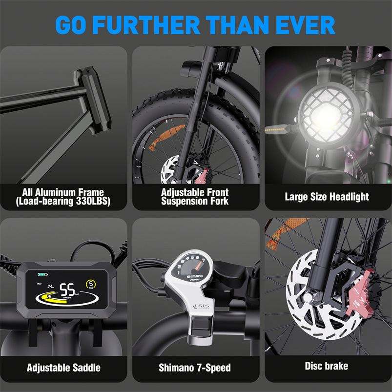 Headlight, Digital Display, Dual Suspension, dual disc brake, Adjustable Seat, Odometer