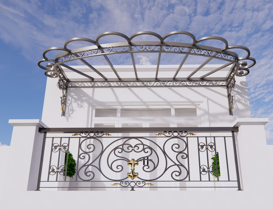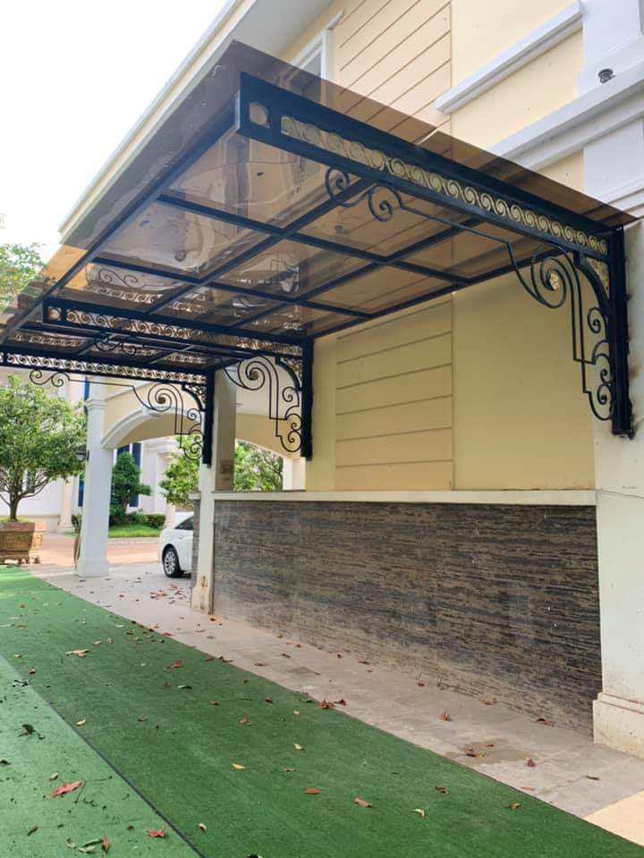 ประตูเหล็กยูโร ผลิตในเวียดนาม สไตล์ยุโรป กันสาดเหล็กดัด โครงเหล็กแข็งแรง 14x14 มม. ขนาด 3x2.2 ม. หลังคาโพลีคาร์บอเนต สีดำทองแดง