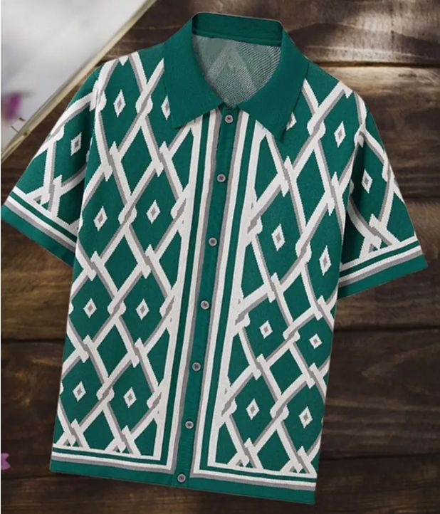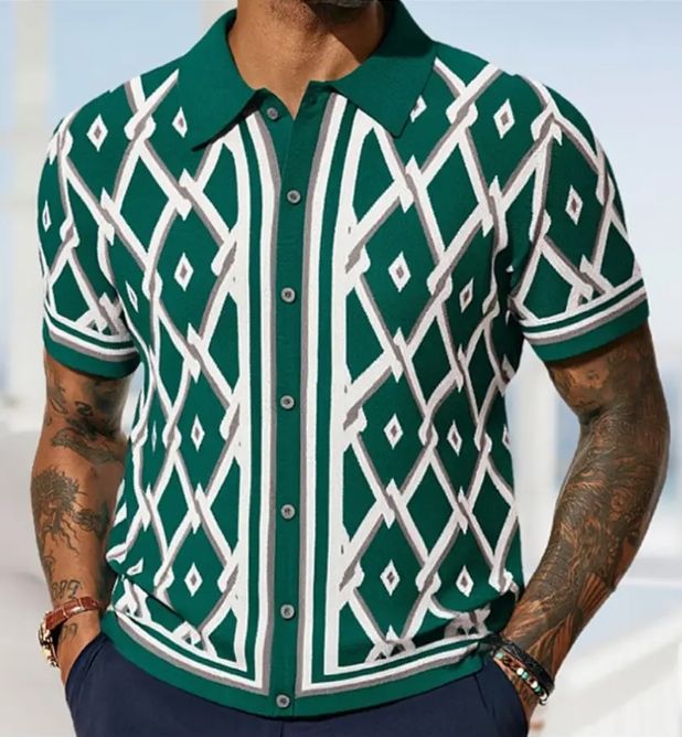 เสื้อโปโลถักลายเพชรสไตล์ยุโรปอเมริกาสำหรับผู้ชาย เสื้อคาร์ดิแกนแขนสั้นถักลายแจ็คการ์ดใหม่สำหรับฤดูร้อน เสื้อยืดผู้ชาย